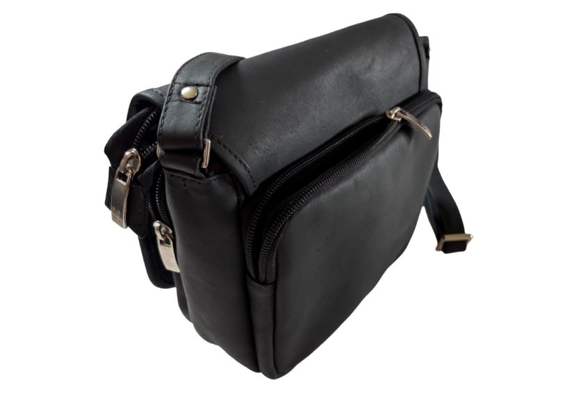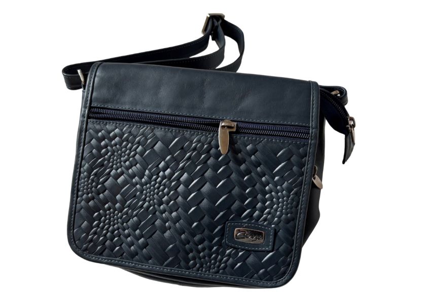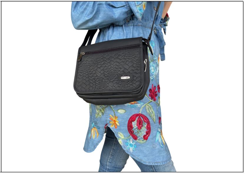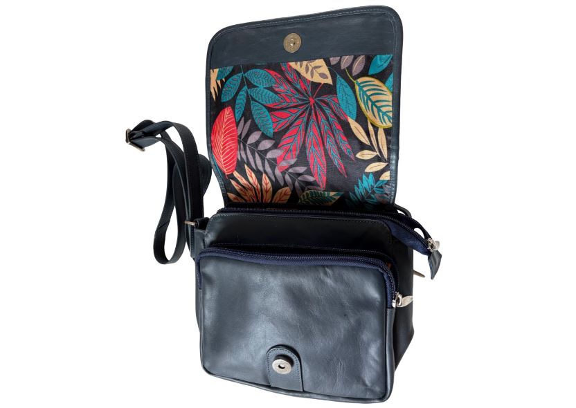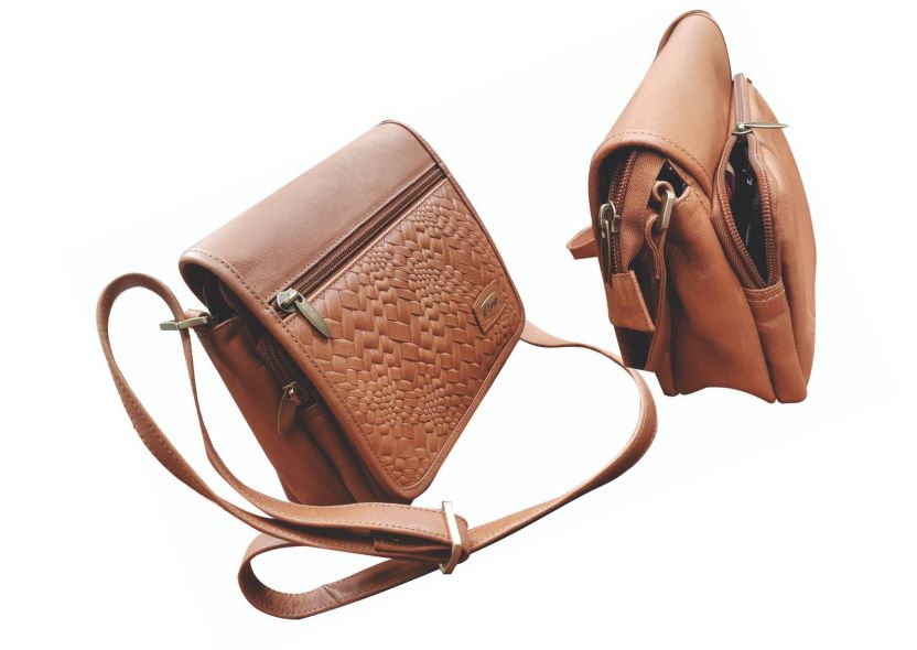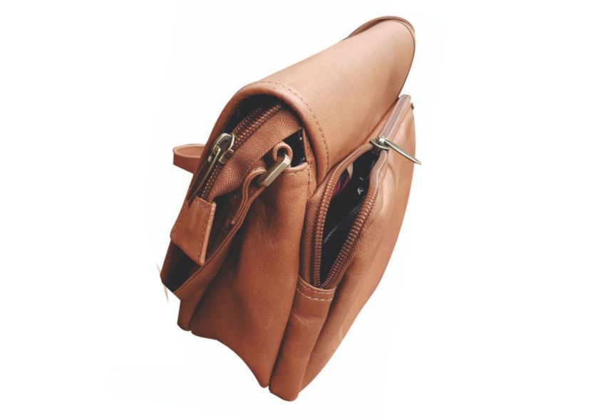 Leather hands-free bag for women, with lid,strap, external front and back pockets, 6 services.