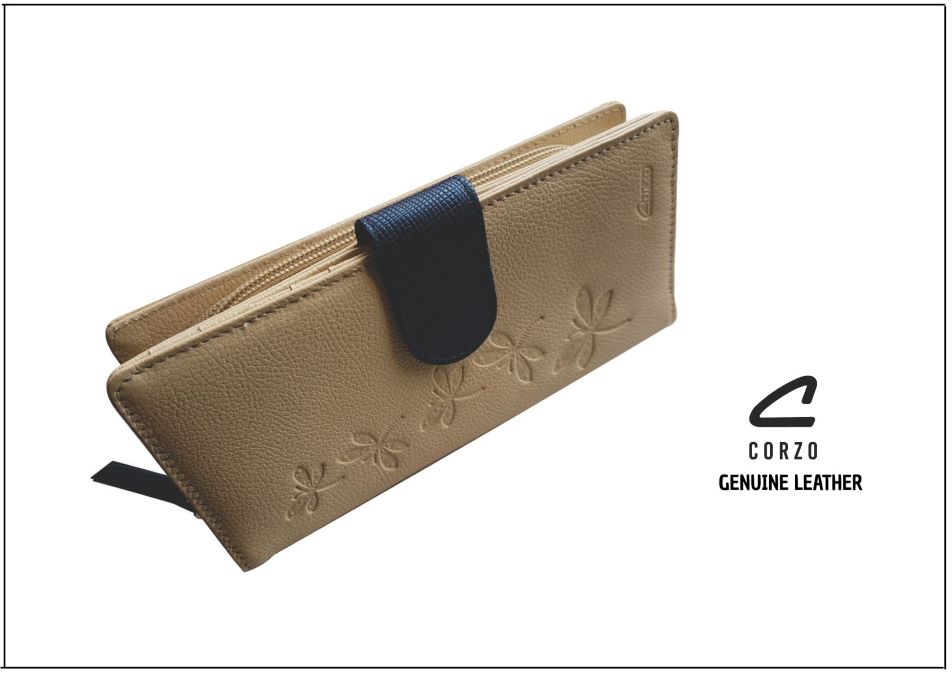 Long leather wallet for women, with outer pocket, flap, double section, 18 services.